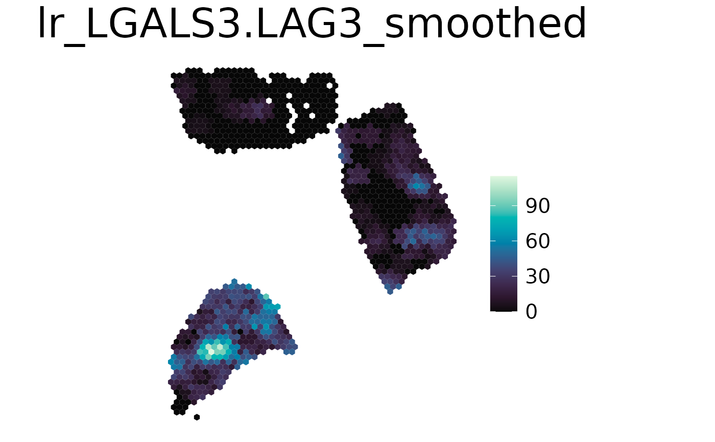 After the calculation the scores for each L-R pair are stored in the ColData of the spe object and are marked with a “lr”.