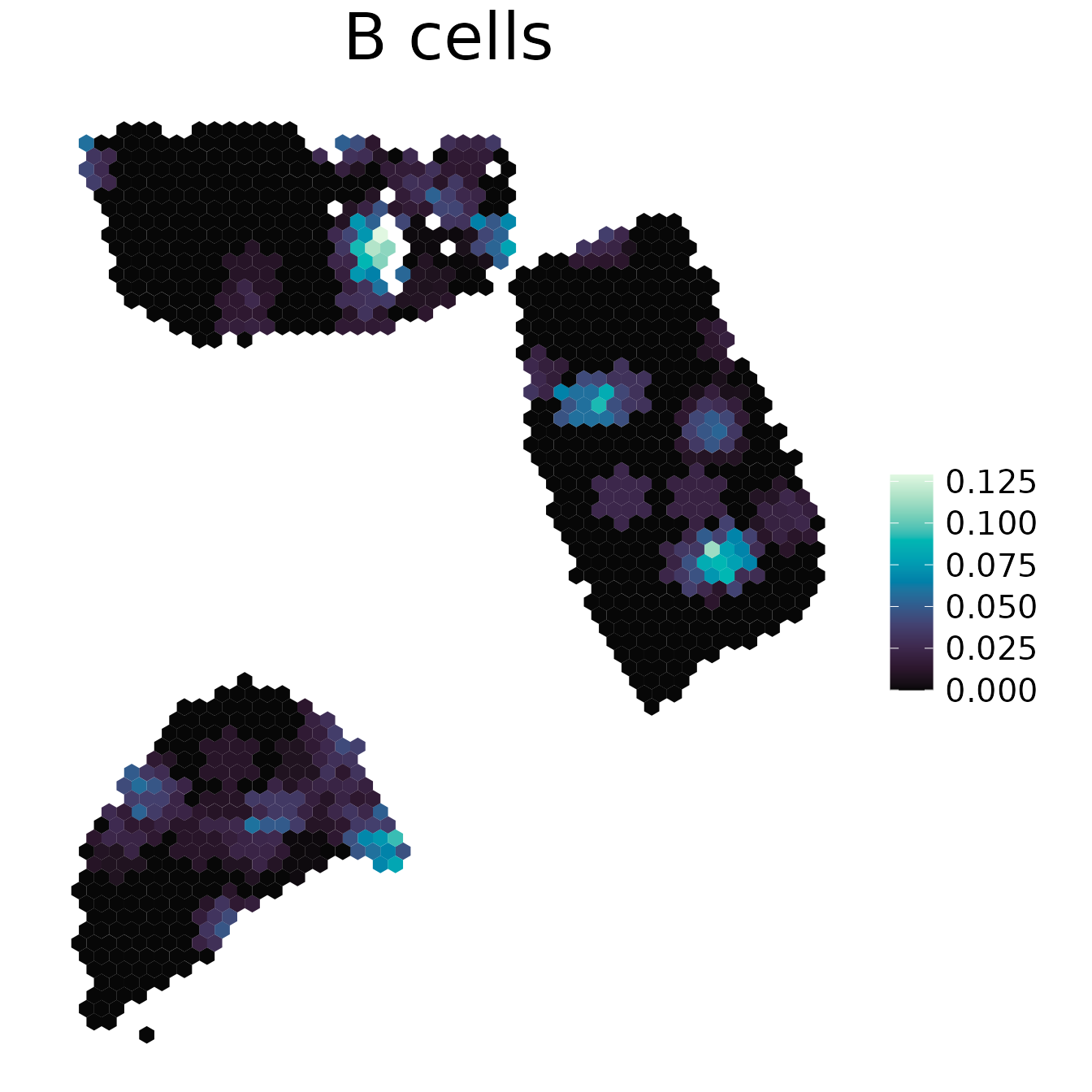 spacedeconv::plot_spatial(deconv, result = "spatialdwls_B.cells", density = F, smooth = T, title="B cells")